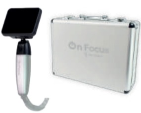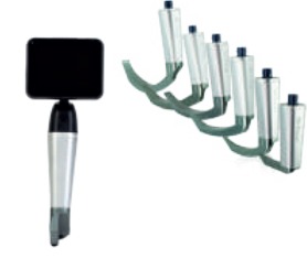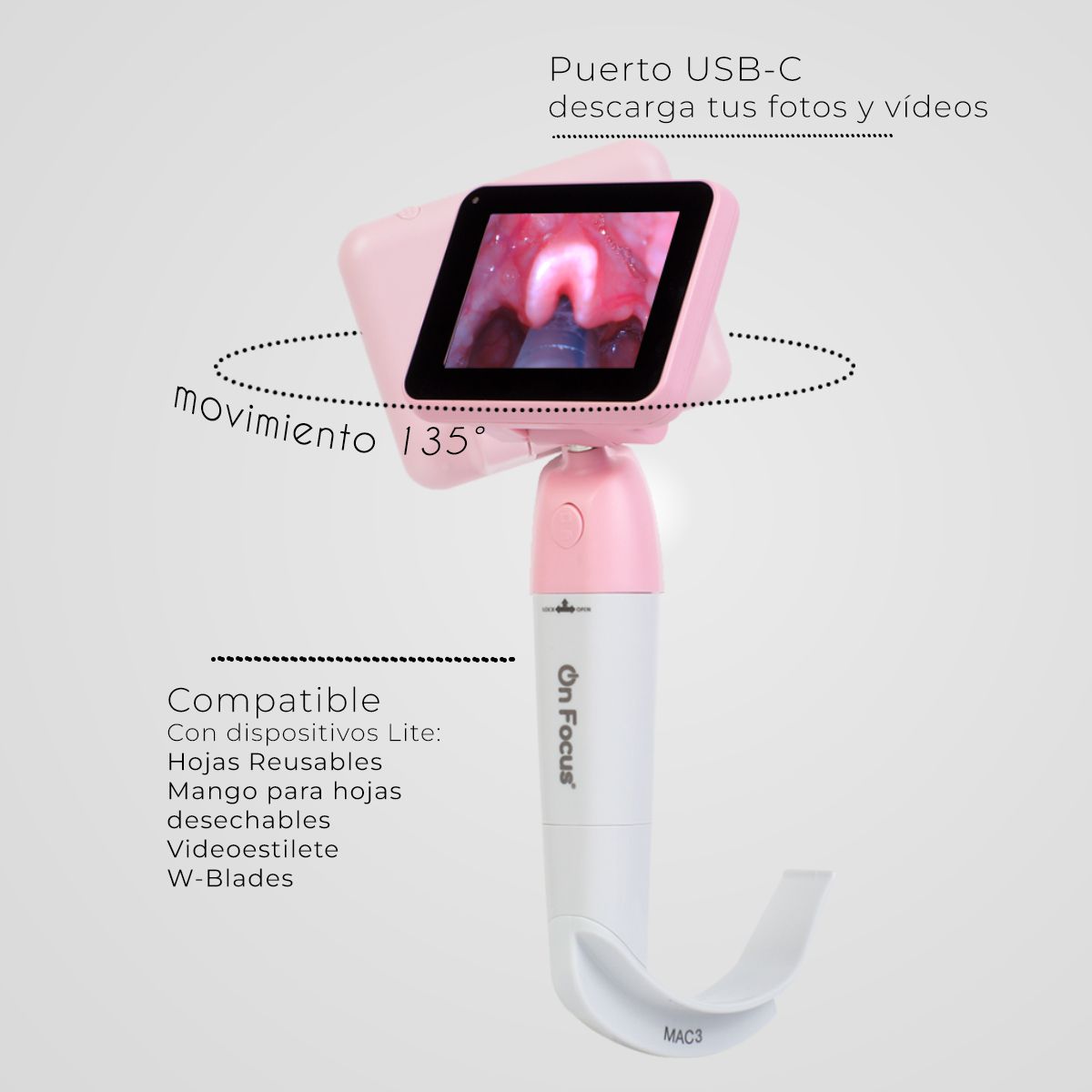 Videoestilete rigido ideal para intubaciones de apertura oral límitada inlcuye sujetador de tubo endotraqueal con toma de oxígeno.